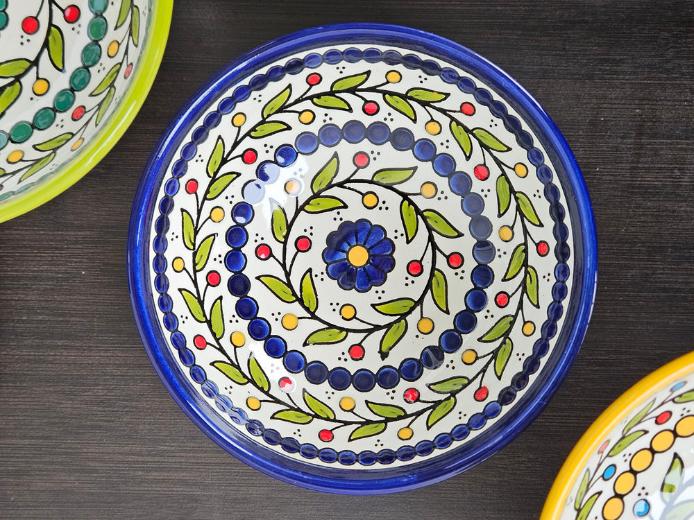 As the bowls are handmade in the city of Al Khalil in Palestine, they may show slight variations in size, colors and patterns. In addition, you may notice minor flaws such as irregularities in the painting technique. These characteristics are typical of their handmade nature and are essentially flawlessly imperfect.